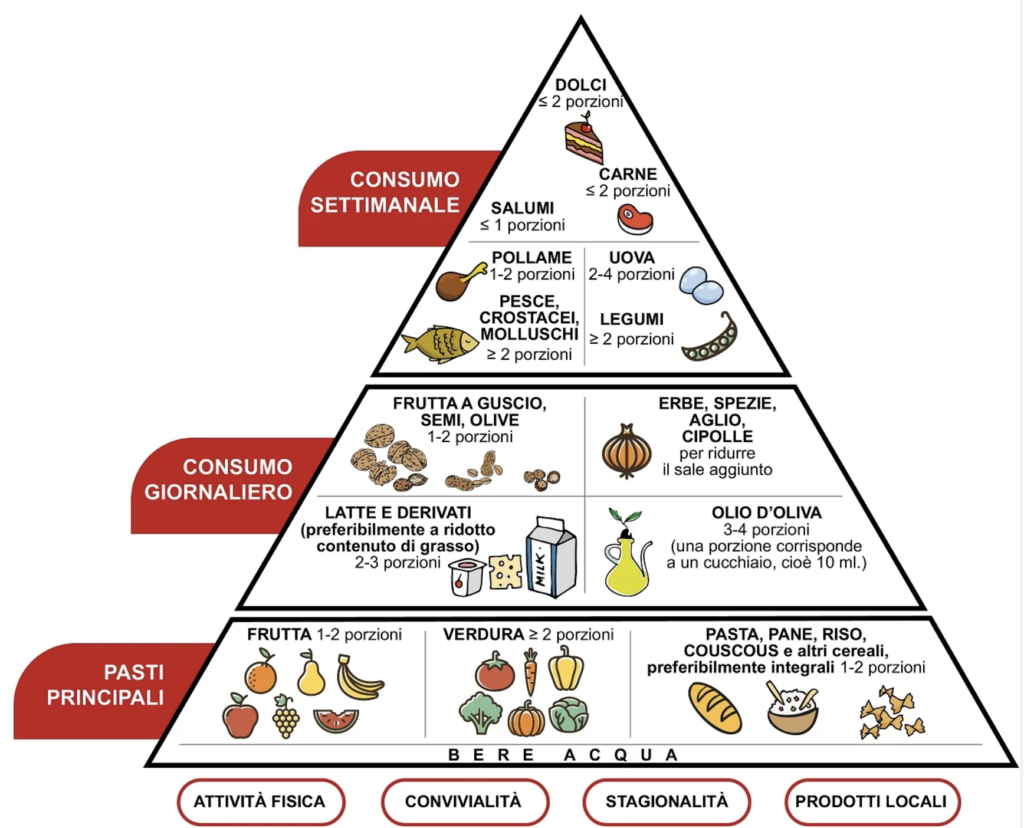 La dieta mediterranea non ricomprende esclusivamente cibi ma una più ampia piramide che prevede delle attività riassunte qui di seguito: